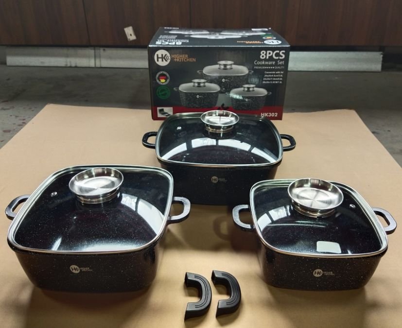 Cet ensemble de cuisine HK Higher Kitchen de 8 pièces se distingue par son design carré unique et son revêtement antiadhésif de haute qualité. Fabriqué en Allemagne, il garantit une cuisson saine et sans effort, réduisant le besoin d’ajouter de l’huile ou de la graisse. Les casseroles sont munies de poignées ergonomiques amovibles pour un rangement facile. Les couvercles en verre trempé avec poignée en acier inoxydable permettent de surveiller la cuisson. Ce set est idéal pour maximiser l’espace de cuisson et préparer une variété de plats, des ragoûts aux viandes braisées.