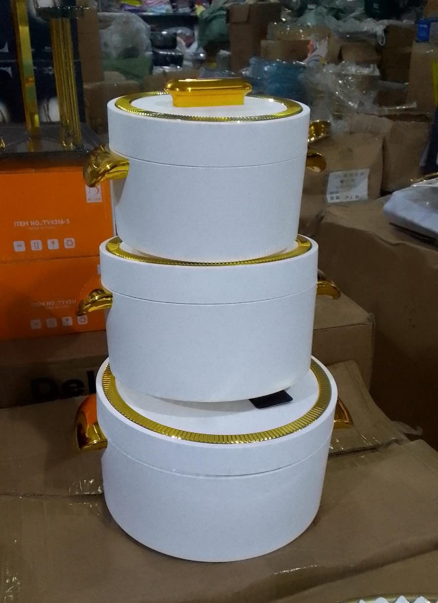 Un ensemble de trois chauffe-plats isothermes élégant et pratique, avec un corps blanc épuré et de luxueuses touches dorées sur les poignées et les bords. Conçus pour être empilables, ils permettent un rangement et une présentation pratiques. Ces chauffe-plats sont idéaux pour servir des plats chauds tout en maintenant leur température et leur fraîcheur. Leurs poignées dorées ajoutent une touche de luxe, faisant d’eux un bel ajout à n’importe quelle table à manger ou buffet.