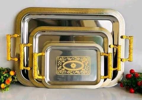Cet ensemble de trois plateaux de service rectangulaires est un mélange parfait de fonctionnalité et de sophistication. Fabriqués en acier inoxydable de haute qualité, ces plateaux sont à la fois durables et faciles à nettoyer. Leurs poignées et bordures dorées ajoutent une touche de luxe, rehaussant leur design. L’ensemble comprend trois tailles différentes, permettant une grande polyvalence, que vous serviez des boissons, des desserts ou des hors-d’œuvre. La surface polie et le motif central élégant sur le plus petit plateau en font des pièces de choix pour les occasions spéciales et les réceptions.