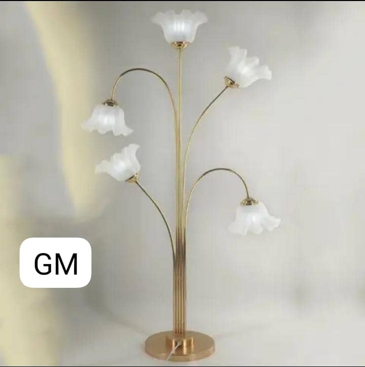 Un lampadaire élégant et floral avec cinq lumières. Son design en forme de fleurs et sa finition dorée apportent une touche de charme et de lumière douce à tout intérieur.