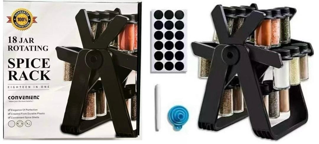 Gardez vos épices bien organisées et facilement accessibles avec ce support rotatif de la marque Convenient. Conçu pour la fonctionnalité et la simplicité, cet ensemble inclut une tour rotative et 18 bocaux transparents, ce qui vous permet de voir le contenu en un coup d’œil. La base rotative vous permet d’accéder à chaque bocal en un seul geste, sans avoir à les déplacer. Fabriqué en plastique durable, il est à la fois robuste et facile à nettoyer. Cet accessoire est un incontournable pour les cuisiniers qui veulent une cuisine ordonnée et efficace, car il combine élégance et praticité.