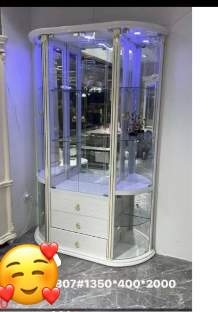 Cette vitrine de luxe est parfaite pour exposer vos objets précieux. Avec ses portes et étagères en verre, son éclairage LED intégré et ses tiroirs de rangement, elle allie élégance et fonctionnalité.